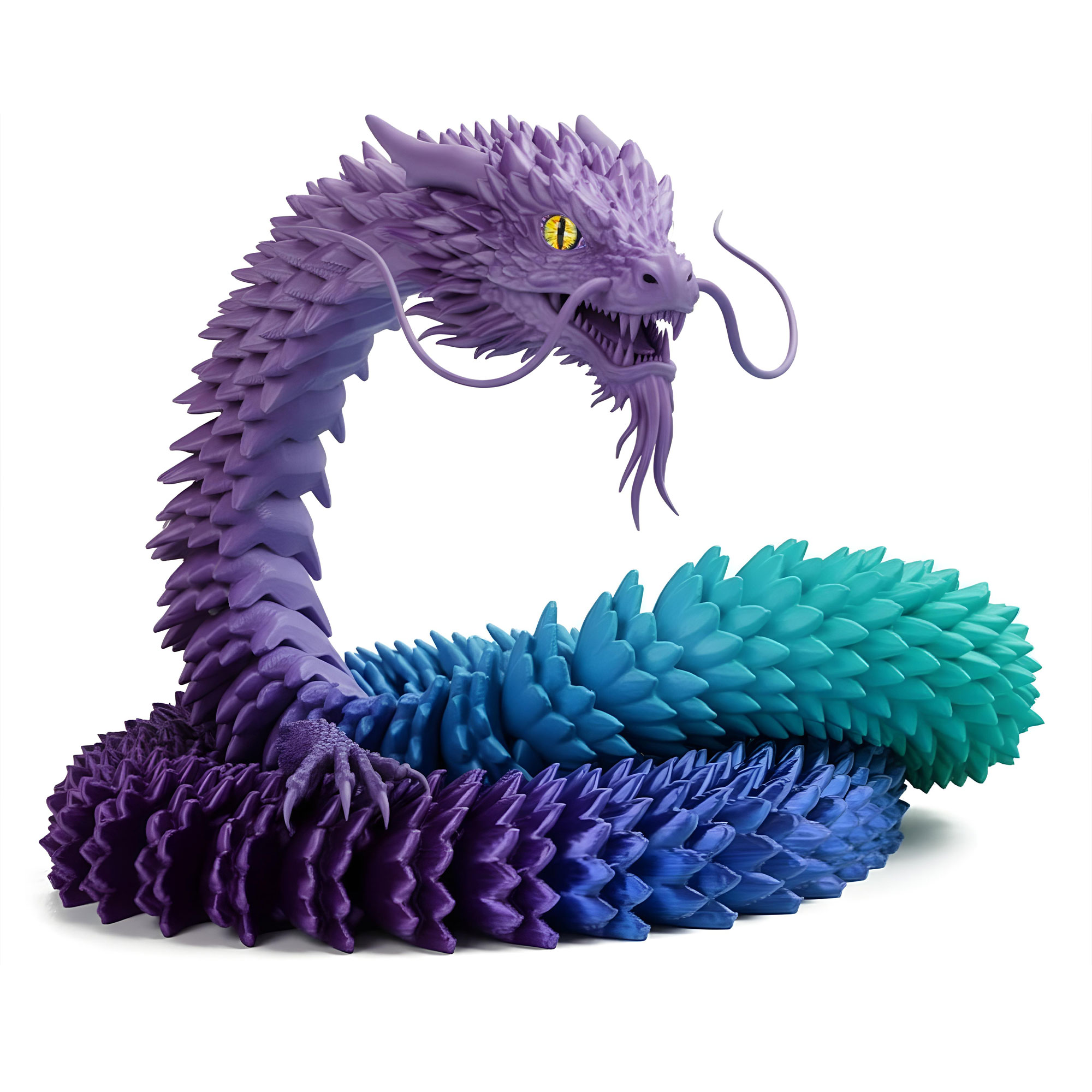 Emberwraith is an elegantly coiled dragon sculpture with layered, petal-like scales that shift from amethyst through cobalt to teal. A sinuous, articulated neck and finely detailed whiskers, fangs, and talons give it a fierce yet graceful presence. Ideal as a bold centerpiece, collector’s item, or striking shelf display.