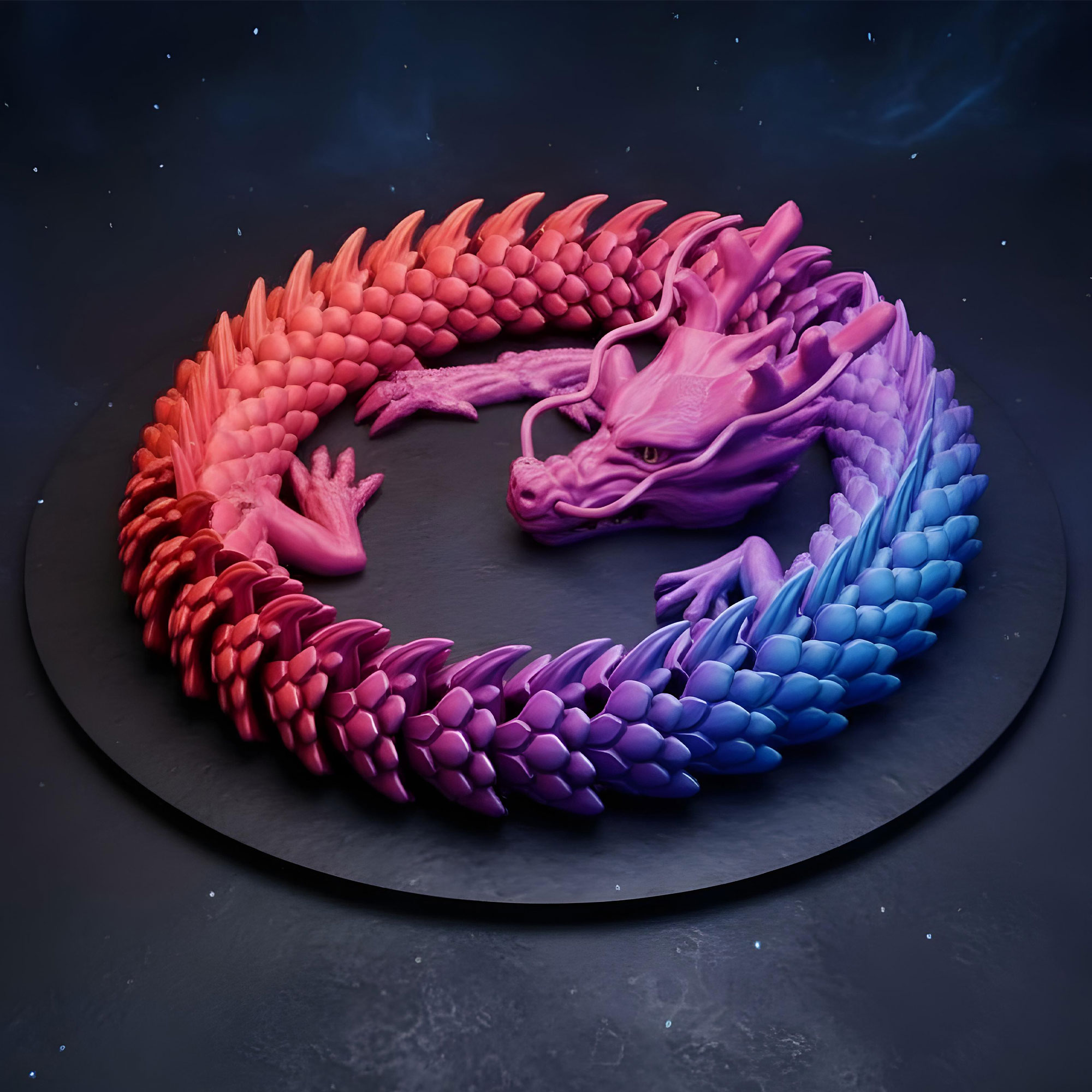 Mystfire is a coiled, jewel-toned dragon figurine with layered, petal-like scales that shift from crimson to violet to cerulean. Finely detailed facial features and flowing whiskers give it an elegant, mythic presence. Special phosphorescent pigments charge under light and emit an enchanting soft glow in darkness, making Mystfire a mesmerizing centerpiece for desks, altars, or collector displays.